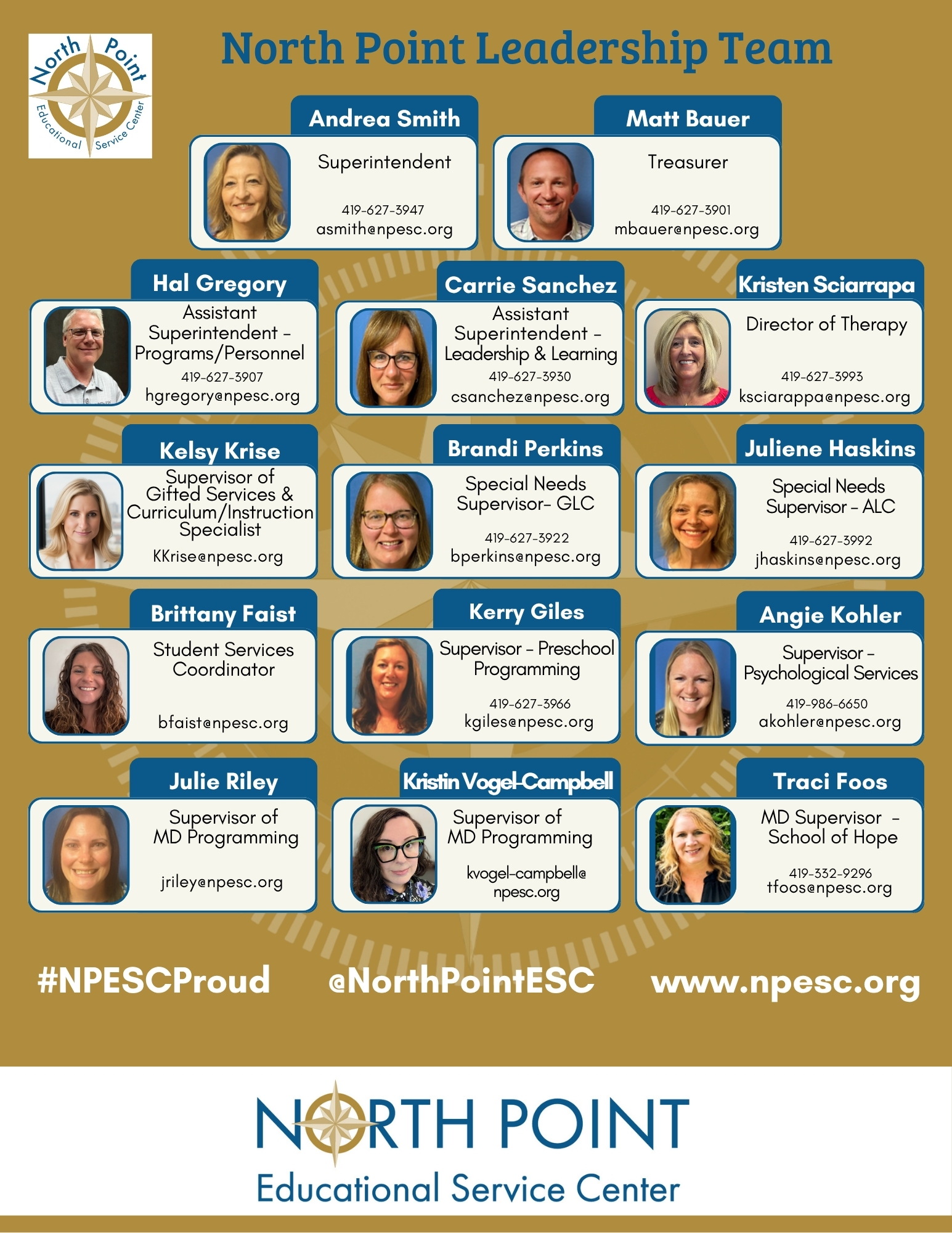 The Therapy Team provides Speech Language Pathologists, Occupational Therapists, Certified Occupational Therapy Assistants, Physical Therapists, Physical Therapy Assistants, and Adapted Physical Education Teachers to the twenty-three districts served by the North Point Educational Service Center. We provide guidance to our districts regarding special education law, equipment for children with special needs, documentation of mandated services, Medicaid billing and professional development for our therapists to ensure that they are up to date on the latest advances in their profession. The therapy team is committed to providing the highest quality services to our districts.